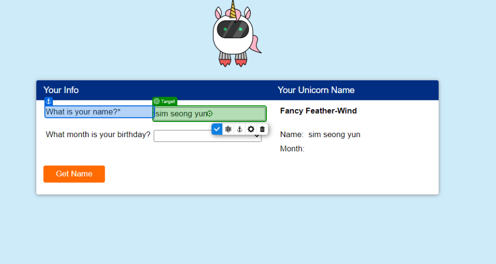 이름을 조회 하였을 때, 랜덤하게 나오는 유니콘 이름을 엑셀 내 원하는 시트에 자동 입력.