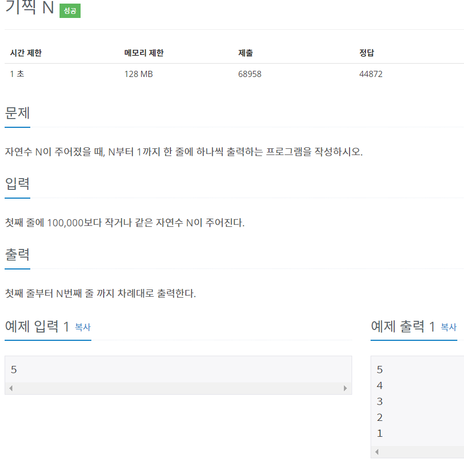 (JAVA) 백준 알고리즘 3단계 2742번 : 기찍N