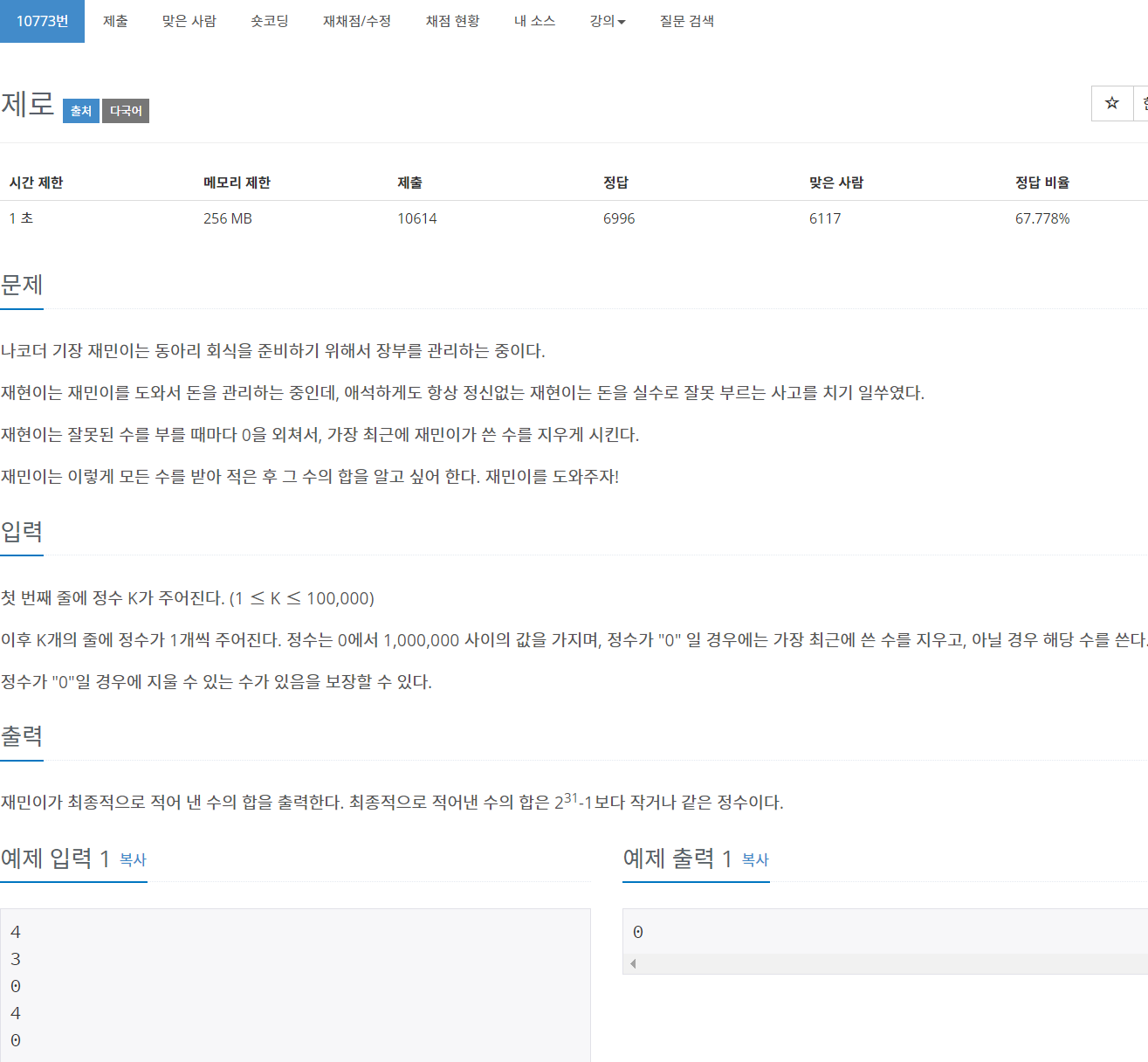 (JAVA) 백준 알고리즘 10773번 : 제로