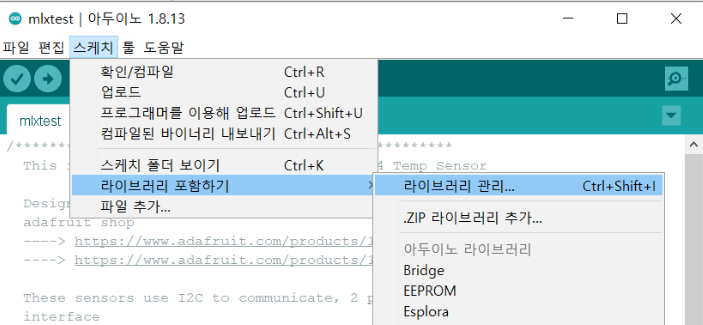 4-1 . arduino sketch 실행 후 [스케치] - [라이브러리 포함하기] - [라이브러리 관리]